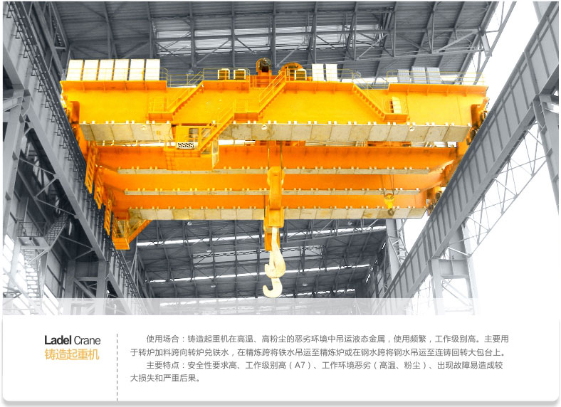 1、 鑄造起重機(jī)是煉鋼連鑄工藝中的主要設(shè)備。主要用于吊運(yùn)和轉(zhuǎn)運(yùn)液態(tài)鋼包。